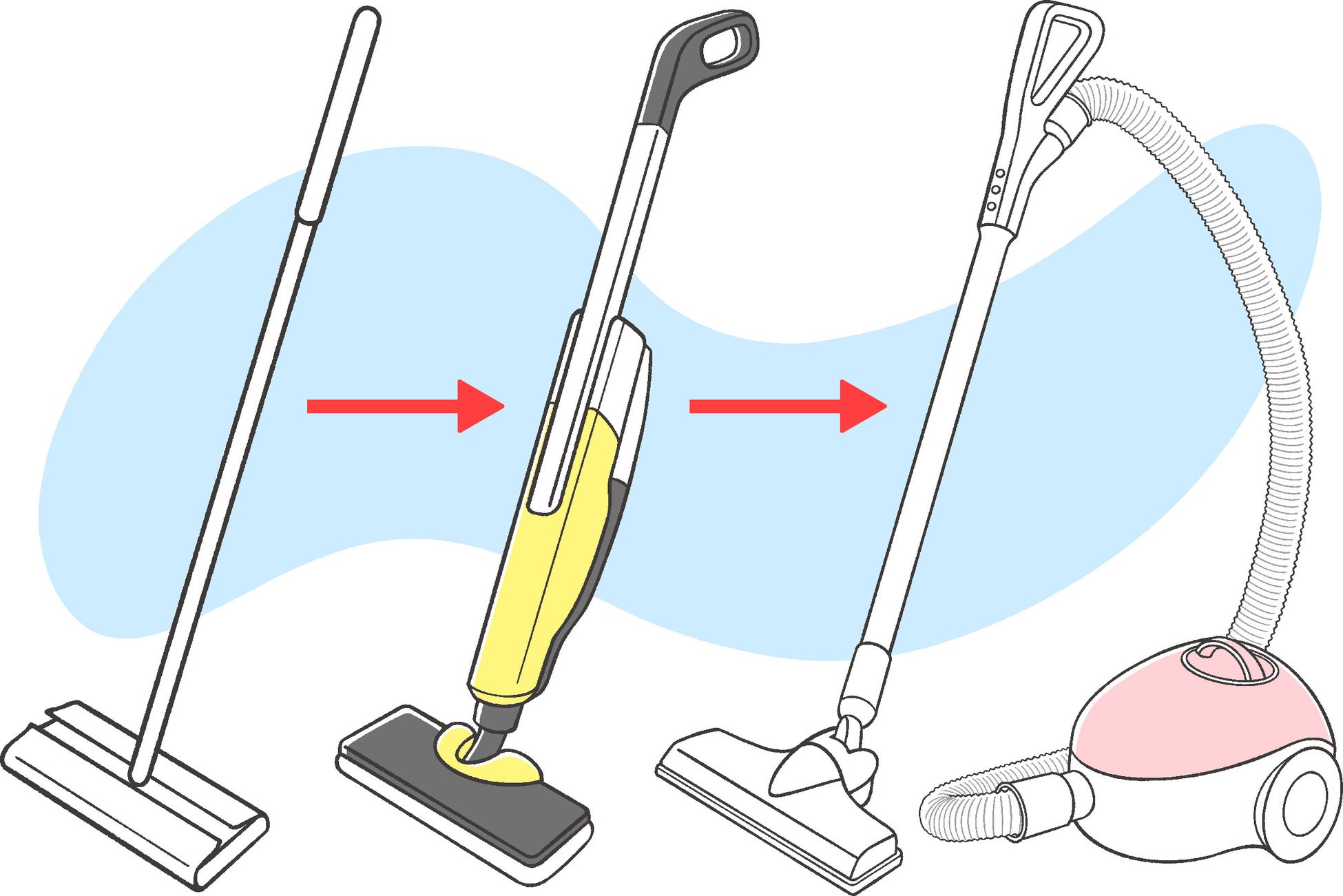 ハウスダストは空気の流れで室内を漂い、やがて壁にぶつかって下に落ちていきます。そのため、壁際は最もハウスダストがたまりやすい場所。まずは乾拭きのモップなどで壁際を一周、ゆっくり静かに拭き、その後、一定方向にS字を描くように動かして床全体を拭きましょう。様々な方向に動かすと、ハウスダストを取り残してしまいます。最後にもう一度壁沿いを一周拭き、掃除中に舞い上がって壁際に移動したハウスダストを取り除きます。その後に行うスチームクリーナーと掃除機も同様です。