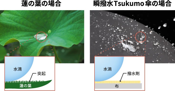 一方「瞬撥水Tsukumo傘」はあえて裏側にコーティングをしないことで、表側も裏側も最高等級の5級(はっ水性試験(JIS L 1092)5級)の撥水を実現しています。