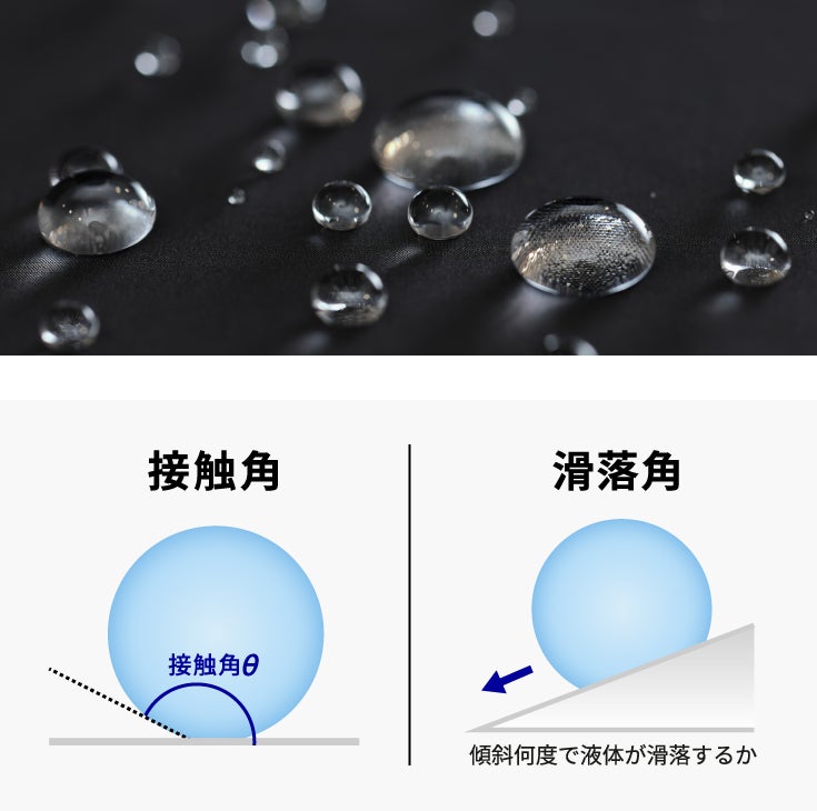 撥水性能の最高等級である5級だけではなく、「瞬撥水Tsukumo傘」は2つの指標も加えて撥水にこだわり抜いています。生地表面の水滴の「丸まり具合」を表す接触角は150°以上、生地をどれくらい傾けると水滴が転がるかを示す滑落角は15°以下。