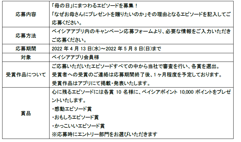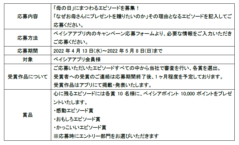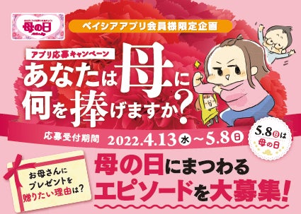 株式会社ベイシア(本社:群馬県前橋市、代表取締役社長:橋本浩英)は、4月13日(水)~5月8日(日)の期間に、ベイシアアプリ内で「あなたは母に何を捧げますか?」と題して、お母さんにまつわるエピソードを募集いたしました。たくさんのご応募をいただき、誠にありがとうございました。このほど受賞作品を決定しましたので発表いたします。