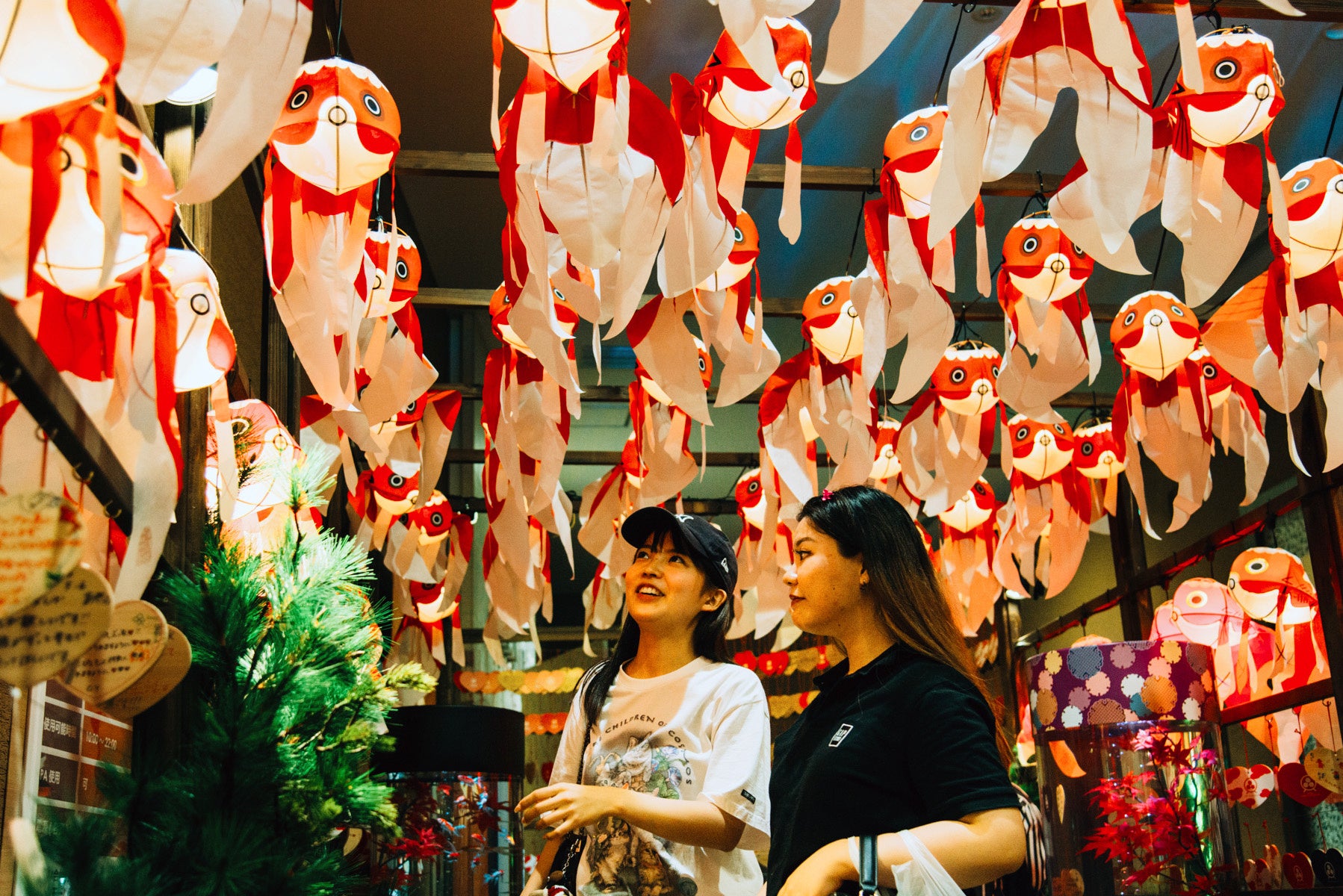 可愛らしい金魚提灯が空中を泳ぎ、温かみのあるオレンジの光に包まれた回遊空間をお楽しみいただけます。