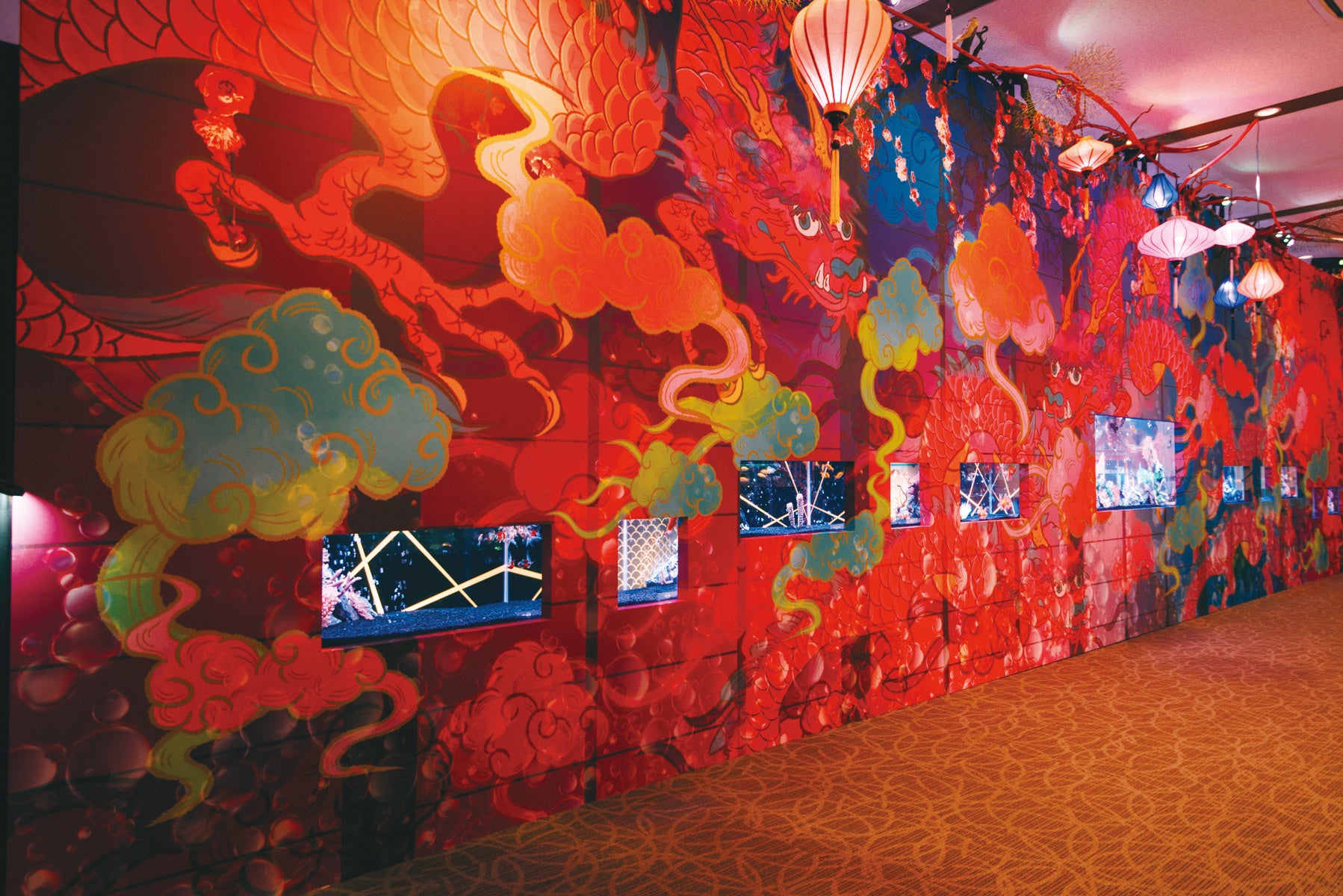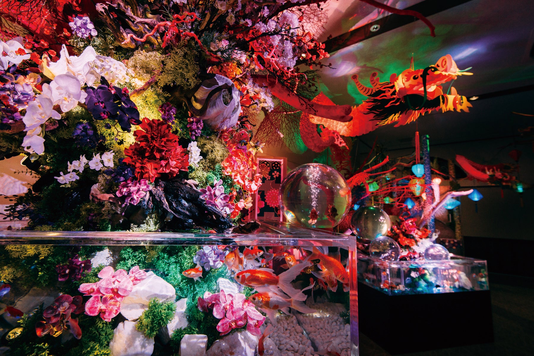 花と金魚、昇龍伝説を連想させる幻想的な空間。それはまさに戦国乱世と華やかな新しい文化が交差する、ここでしか体感できない五感を刺激する作品です。