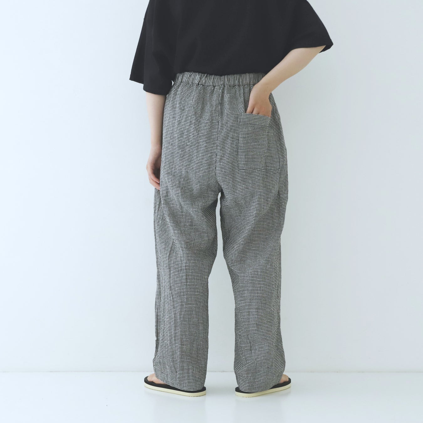 ウエストゴム仕様のイージーパンツ。裾に向かってテーパードさせたすっきりとしたシルエットに仕上げました。シンプルなデザインで着回しの幅が広がる1枚です。