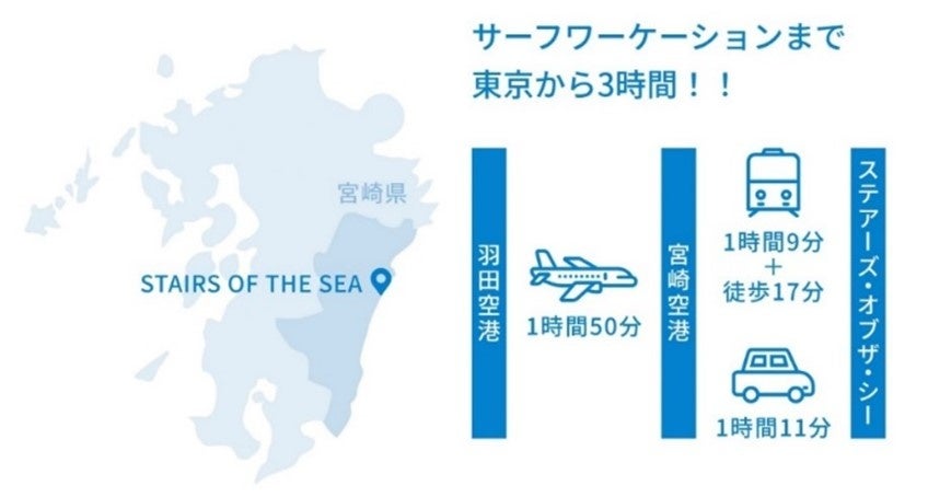 ヤシの木が立ち並ぶ宮崎の海まで、東京からたったの3時間。宮崎空港からのアクセスも、海沿いを通るので爽快です。
