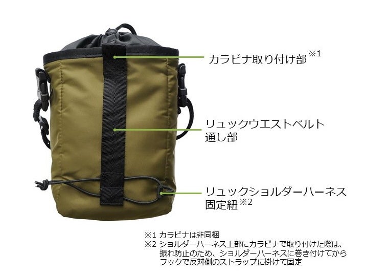 ※1 リュックのウエストベルトやショルダーハーネスに装着する際は、落下防止のため市販のカラビナ等との併用を推奨
