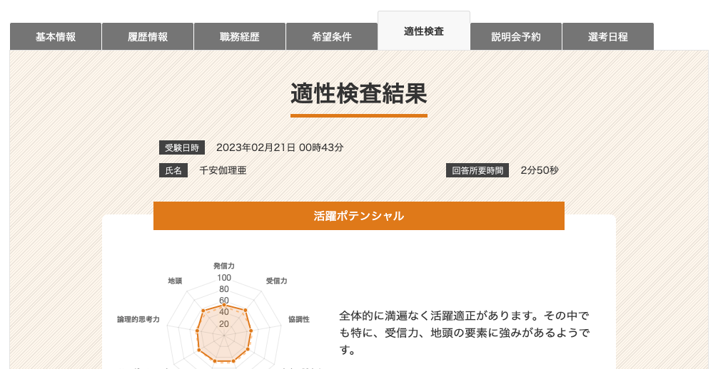 診断結果は2つの結果シートで表され、全体のレーダーチャートと概要、項目ごとの点数、受験日時、回答にかかった時間を確認できます。過去の受験情報も保存されるため、時期の変化によって診断結果の推移を見ることも可能です。
