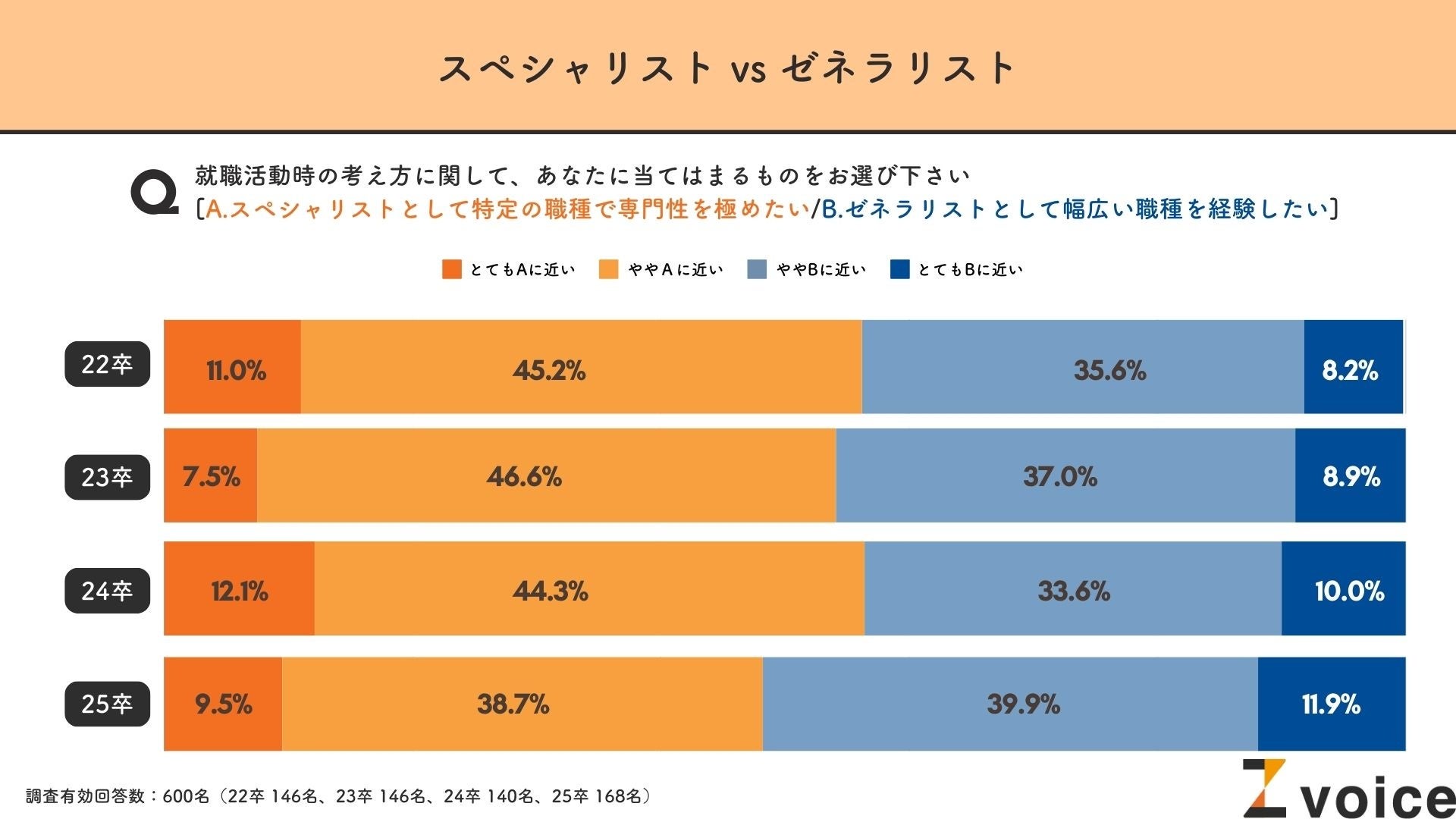 最後に、キャリアにおいて特定の職種で専門性を極めるスペシャリストと、幅広い職種を経験するゼネラリスト、どちらが希望に近いかを質問。すると、22卒~24卒では過半数がスペシャリストを挙げましたが、25卒は51.8%がゼネラリストを挙げ、わずかながら25卒が他の世代とは違う特徴を見せる結果となりました。
