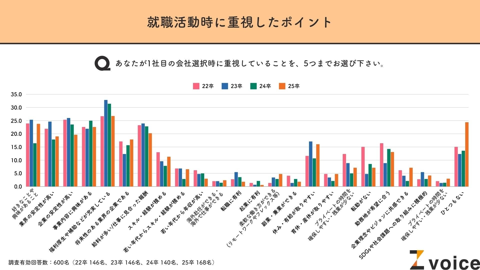 続いて、会社選びで重視することについて聞いたところ、いずれの世代も1位は「福利厚生や補助などが充実している」という回答に。また、「企業の安定性が高い」も22~24卒で20%以上、25卒も19.6%が挙げており、「安心・安定」はZ世代の就活において、重要なキーワードと言えそうです。