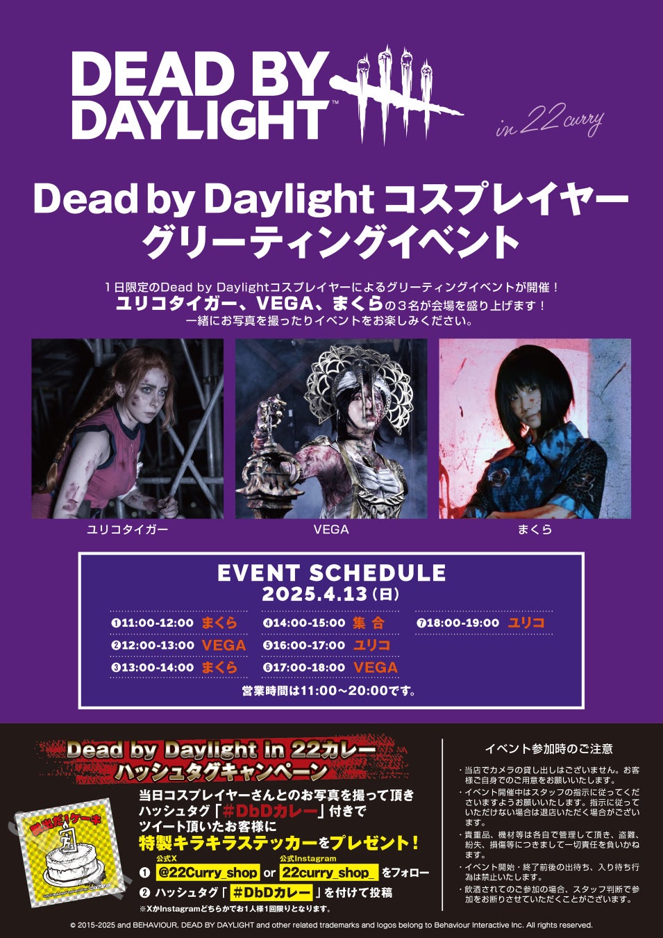 株式会社マズル(本社:東京都千代⽥区 代表取締役:近内 裕基)は、4月3日(木)より『Dead by Daylight』 in 22カレーを開催いたします。