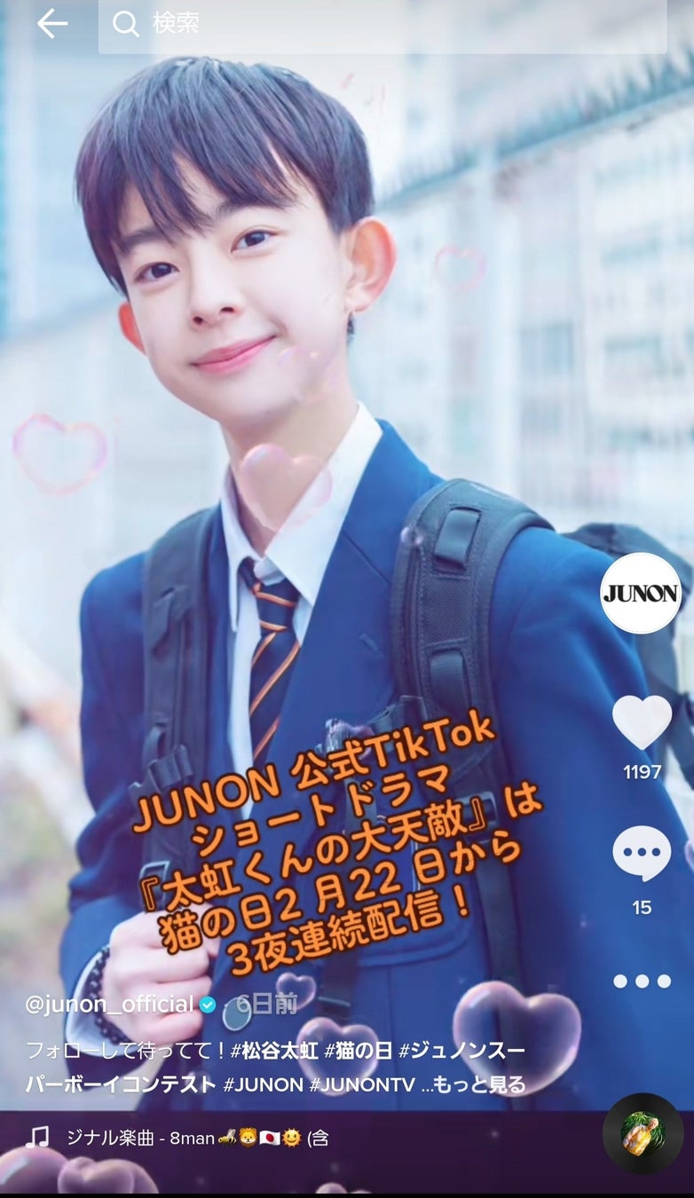 イケメンをこよなく愛する女性へ「夢を推す想い」と「至福の時間」を生み続けるJUNONが、ショートムービープラットフォーム「TikTok(ティックトック)」にて、2/22から3夜連続で公開した、JUNON初オリジナル縦型ドラマ 「太虹くんの大天敵」の合計再生数が200万再生、合計いいね数は11万、総再生時間は25,546時間(約1,064日分)※2/28時点 を突破しました。今後もジュノン・スーパーボーイ・コンテストと連動したTikTok企画を実施するので、ご注目ください。