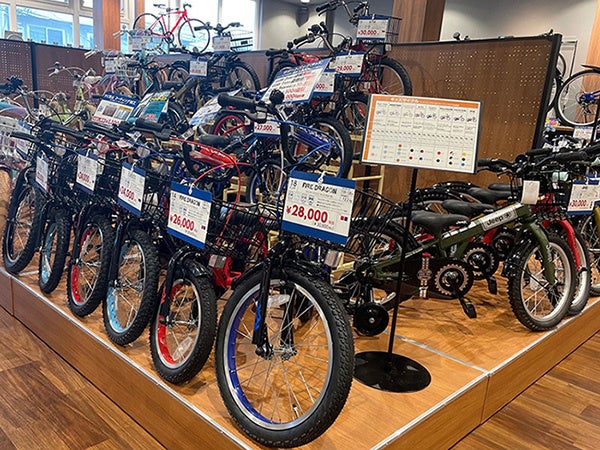 また、2階にはシティサイクル、スポーツサイクル、ミニベロ・折畳車、子供車、幼児車と幅広い年齢の方に向けた自転車をご用意いたしております。