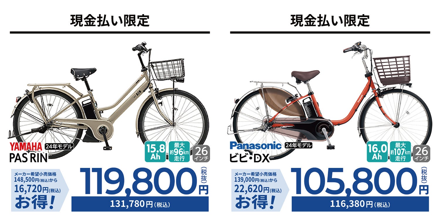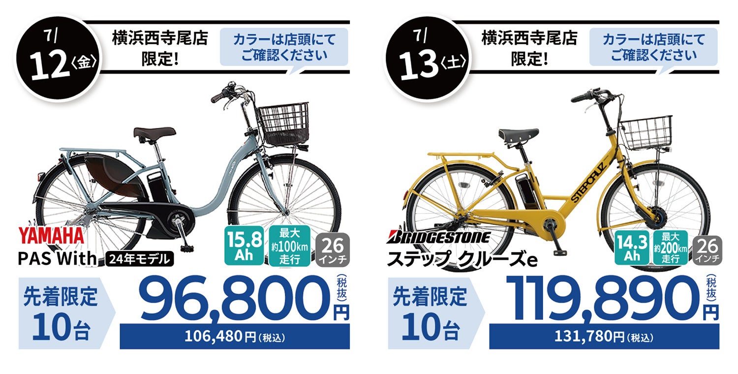 各種電動アシスト自転車に関してはWebサイト(https://www.daiwa-cycle.co.jp/feature/open_yokohamanishiterao)よりクーポンをご持参いただくと12,000円(税込)引で販売をさせていただきます。(クーポン利用については条件がございますので、クーポン券の注記をご確認の上ご利用願います。)