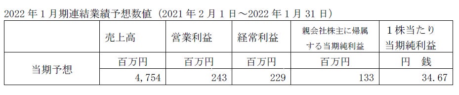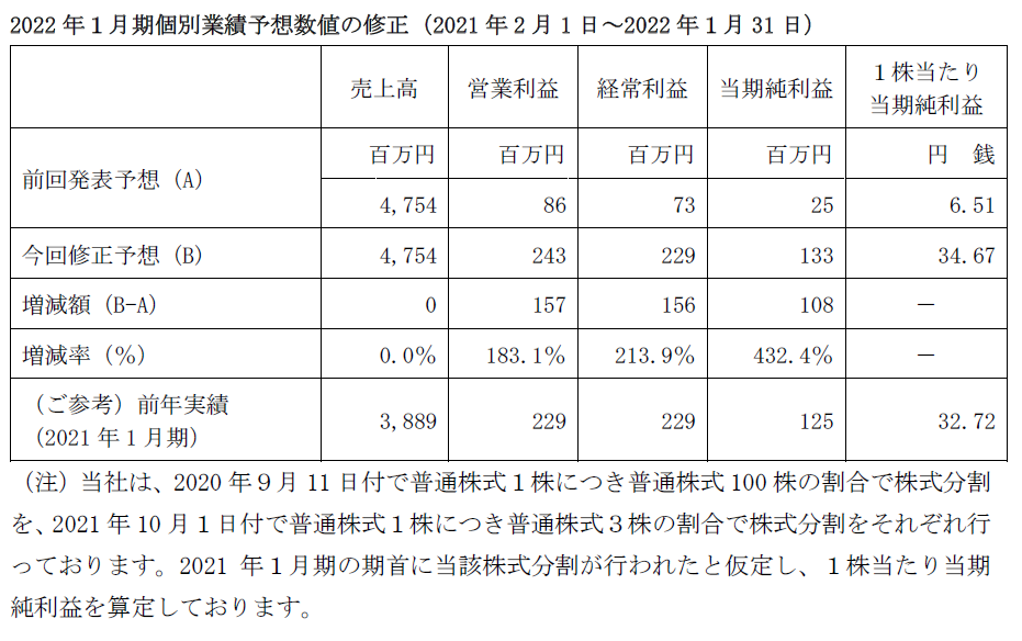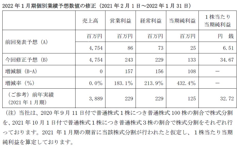 その結果、営業利益等が2021年9月10日に公表した2021年1月期 通期個別業績予想を上回る見込みとなりましたので、このたび再度修正いたしました。