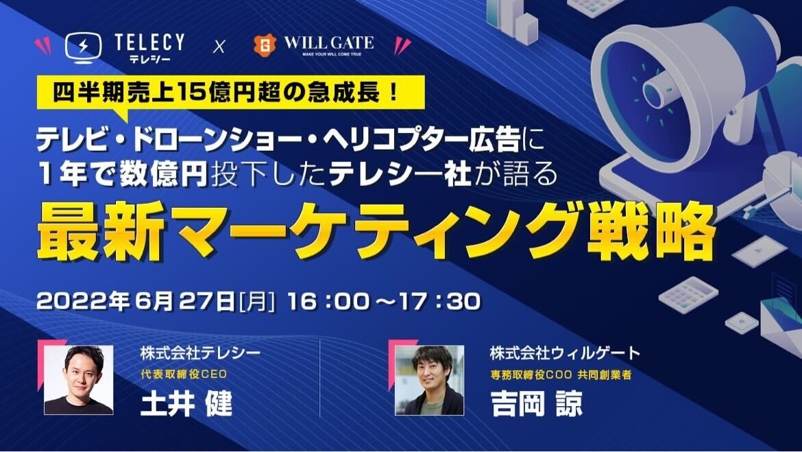 本ウェビナーでは、弊社代表取締役CEO 土井 健と、ウィルゲート社専務取締役COO 吉岡 諒氏が、四半期売上15億円超のテレシー急成長の秘訣や、日本で初めて広告媒体としてドローンショーを取り扱うといった、最新マーケティング戦略についてお話いたします。