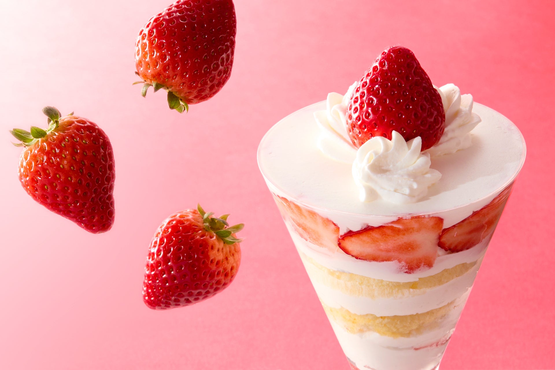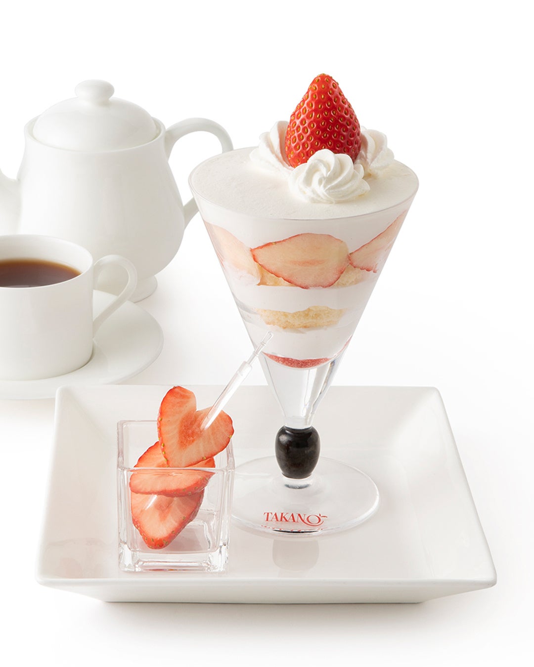 タカノフルーツパーラを代表するパフェのグラスに、ショートケーキを詰め込みました。純白のホイップクリームに真っ赤な苺とスポンジが重なり、素材ひとつひとつが織りなすフィーリングを味わうことができます。