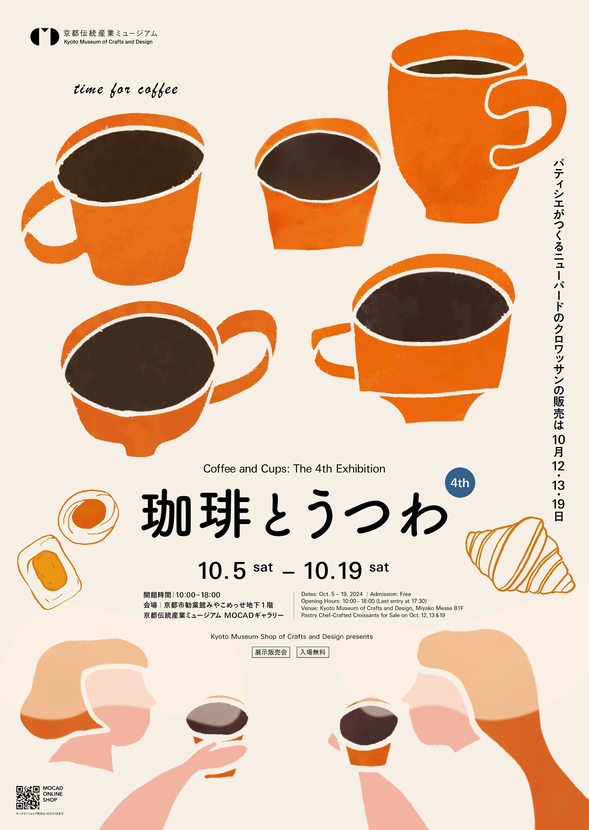 京都の人気自家焙煎コーヒーショップ「グローブマウンテン珈琲」、自家焙煎珈琲と季節のお菓子の「暖々」、みやこめっせ館内「ABURU」のコーヒーと、京都・寺町にある明治40年創業の洋菓子店「京都 村上開新堂」の焼菓子、パティシエがつくる「ニューバード」のクロワッサンなどを、会場で特別にお楽しみいただけます。