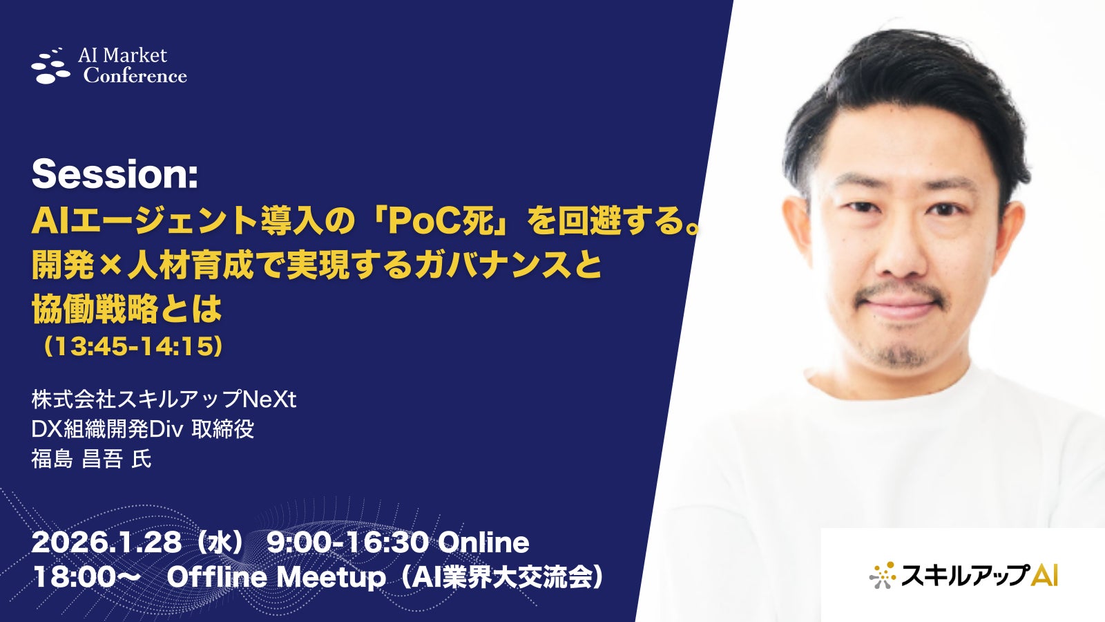 【登壇情報】スキルアップNeXt社による「AIエージェント導入の「PoC死」を回避する。開発×人材育成で実現するガバナンスと協働戦略とは」|1.28|AI Market Conference 2026