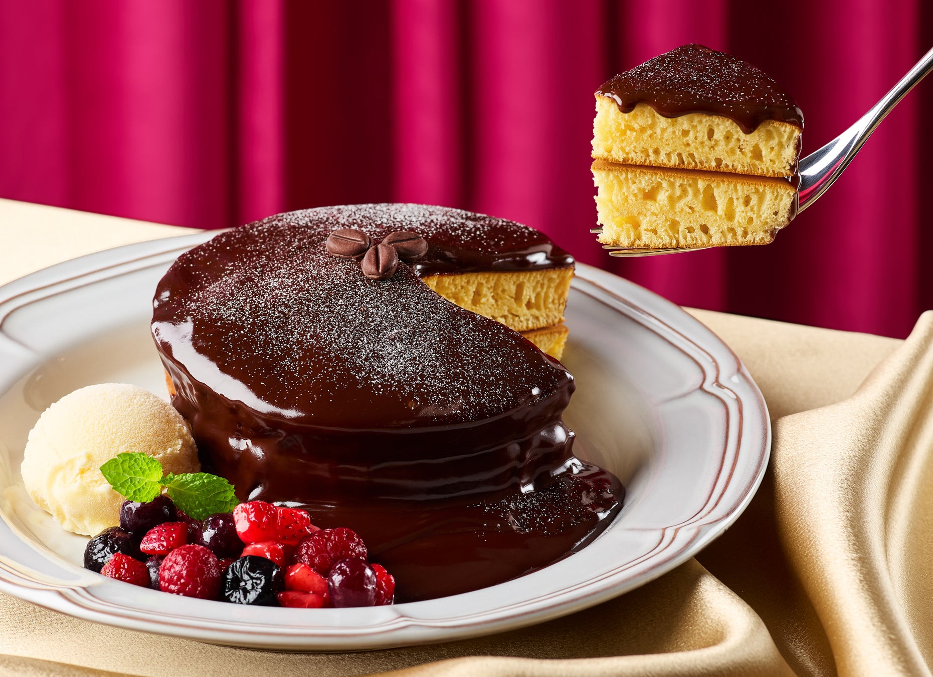 「大人向けのビターチョコレート」の味わいをしっかり楽しんでいただくため、最初はチョコレートソースとホットケーキのみでお召し上がりいただくことをおすすめします。その後、つけ合わせの甘酸っぱいベリーとともに、最後はベリーとアイスを乗せるなど、トッピングの組み合わせを試していただきながら、お好みのお召し上がり方を見つけてください。
