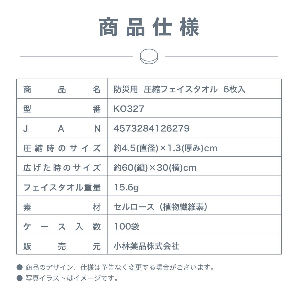 個包装6個入り。圧縮タイプなのでコンパクトに常備ができ、災害時はもちろん旅行やアウトドアなどでも、いざという時に役立ちます!