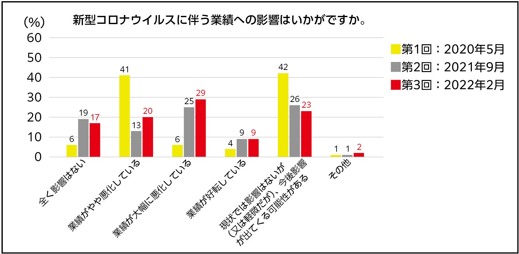 新型コロナウイルス感染拡大の影響で「業績が大幅に悪化している」と回答した割合が第3回では過去最多の29%となり、流行初期には顕在化していなかった問題が浮かび上がっていることが見て取れます。また、前回の調査と比較してさらなる成長のために既存事業へ注力する傾向も強まっています。