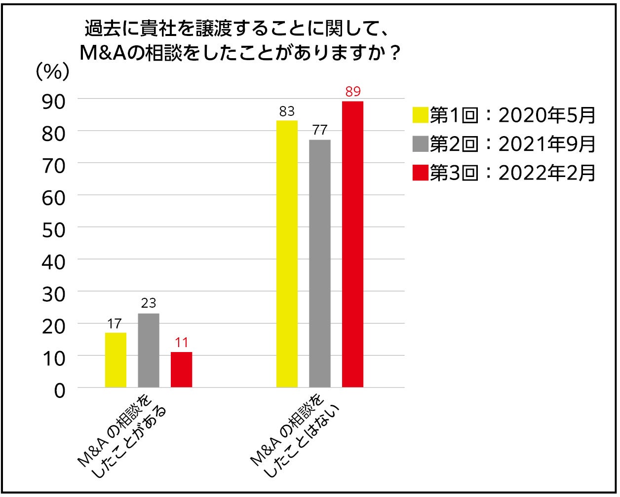 事業承継の時期について「1~3年以内」という回答が増えています。新型コロナウイルスの影響で変化した考え方については「事業譲渡の時期を明確に意識するようになった」と回答した方が約半数となっていますが、9割近くのオーナーが自社の譲渡についての相談経験はないことが分かりました。