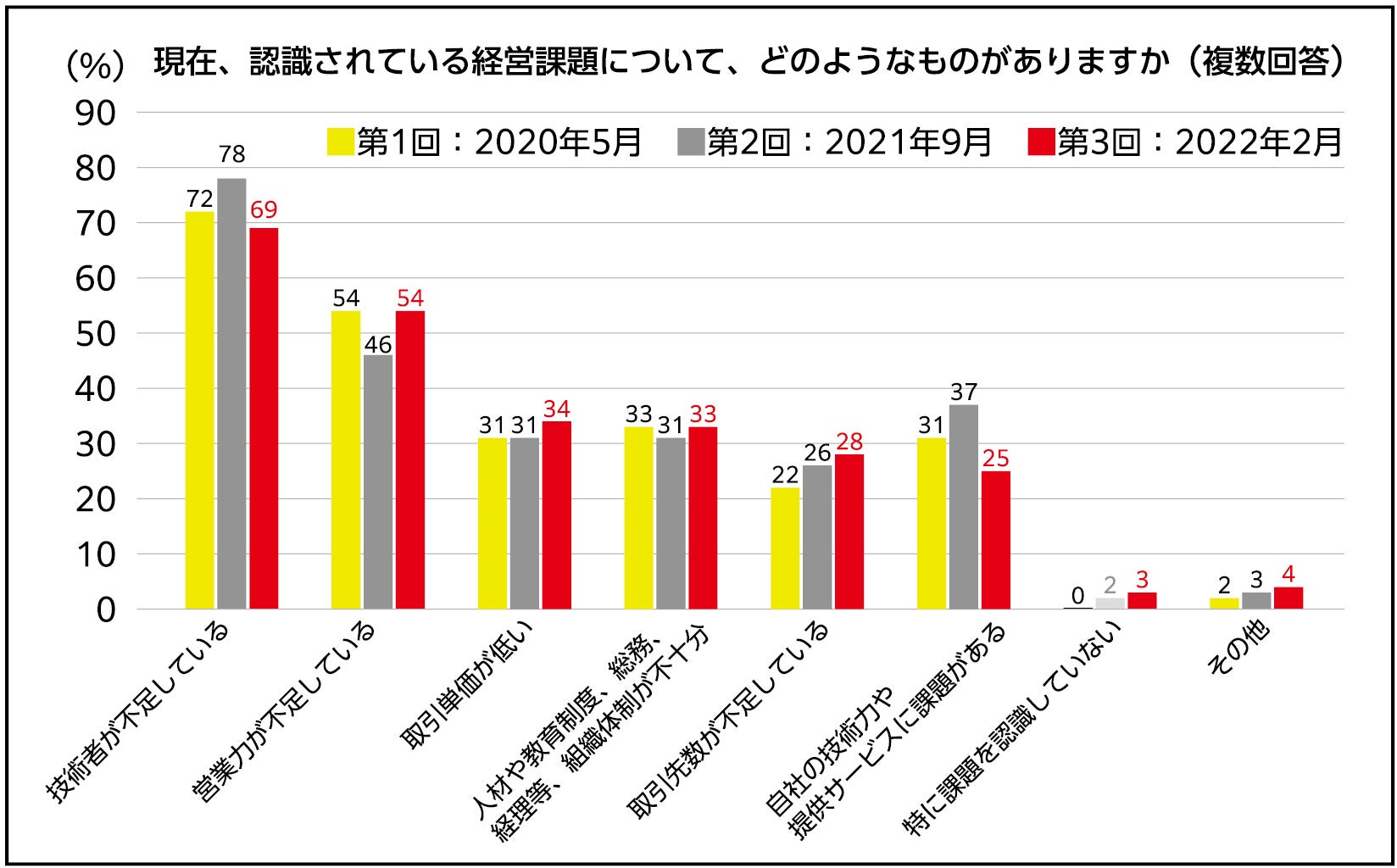 自社の経営課題については、前回、前々回の調査と同様にトップは「技術者不足」(第1回:72%、第2回78%、第3回:69%)、続いて「営業力不足」(第1回:54%、第2回:46%、第3回:54%)となり、依然として人材不足が業界全体の課題であることがうかがえます。