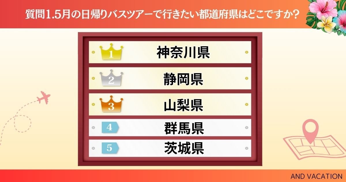 そこで、5月の日帰りバスツアーでどの都道府県に行きたいのか、関東の人にアンケートで聞き取り調査をしました。ぜひ、チェックしてみてください!