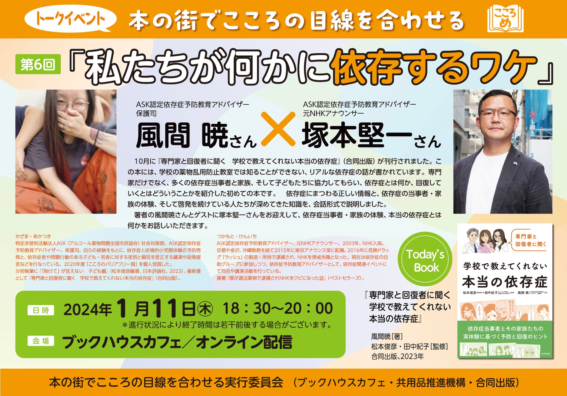 著者の風間暁さんとゲストに塚本堅一さんをお迎えして、依存症当事者・家族の体験、本当の依存症とは何かをお話しいただきます。