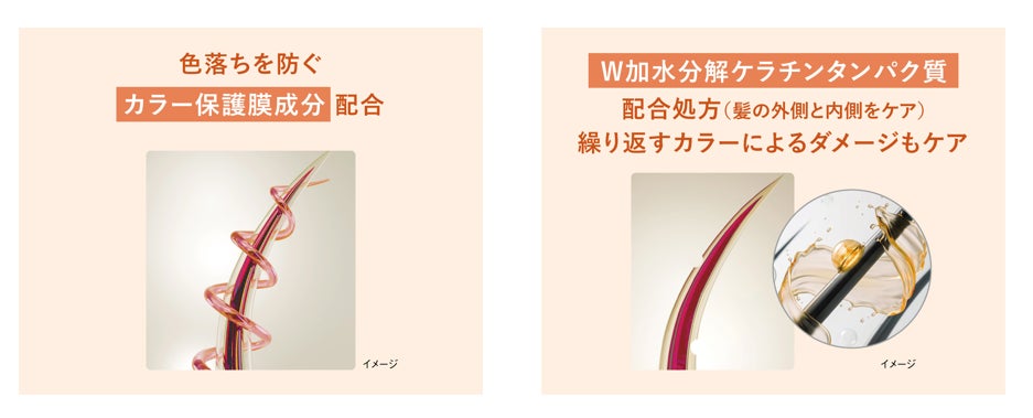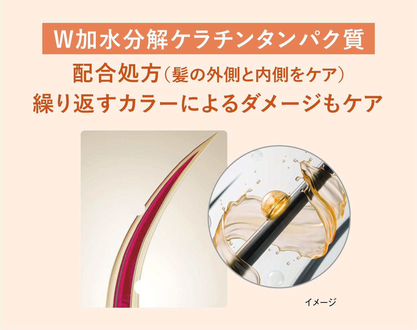 カラーされた髪の色落ちを防ぐカラー保護膜成分が、ユニリーバ・ジャパンとして初めて配合されています。また、髪を構成するケラチン(タンパク質)由来の2種類の成分で、髪の表面と内側を補修するW加水分解ケラチンタンパク質*2も配合されています。