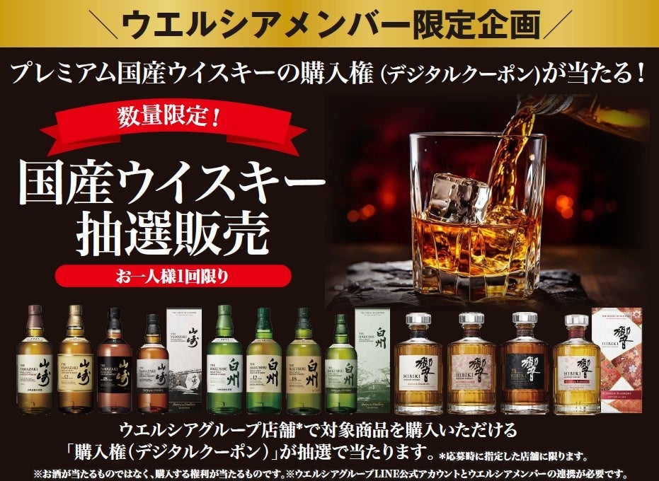 ウエルシア薬局株式会社(本社:東京都千代田区、代表取締役社長:田中純一、以下 ウエルシア薬局)は、ウエルシアグループのドラッグストア会社※1とともに、ウエルシアメンバーにご登録をいただいていますお客さまを対象に国産ウイスキーを抽選販売※2いたします。本抽選販売に関わり11月15日(金)から11月30日(土)までの期間にウエルシアの公式LINEアカウントからご応募いただけます。