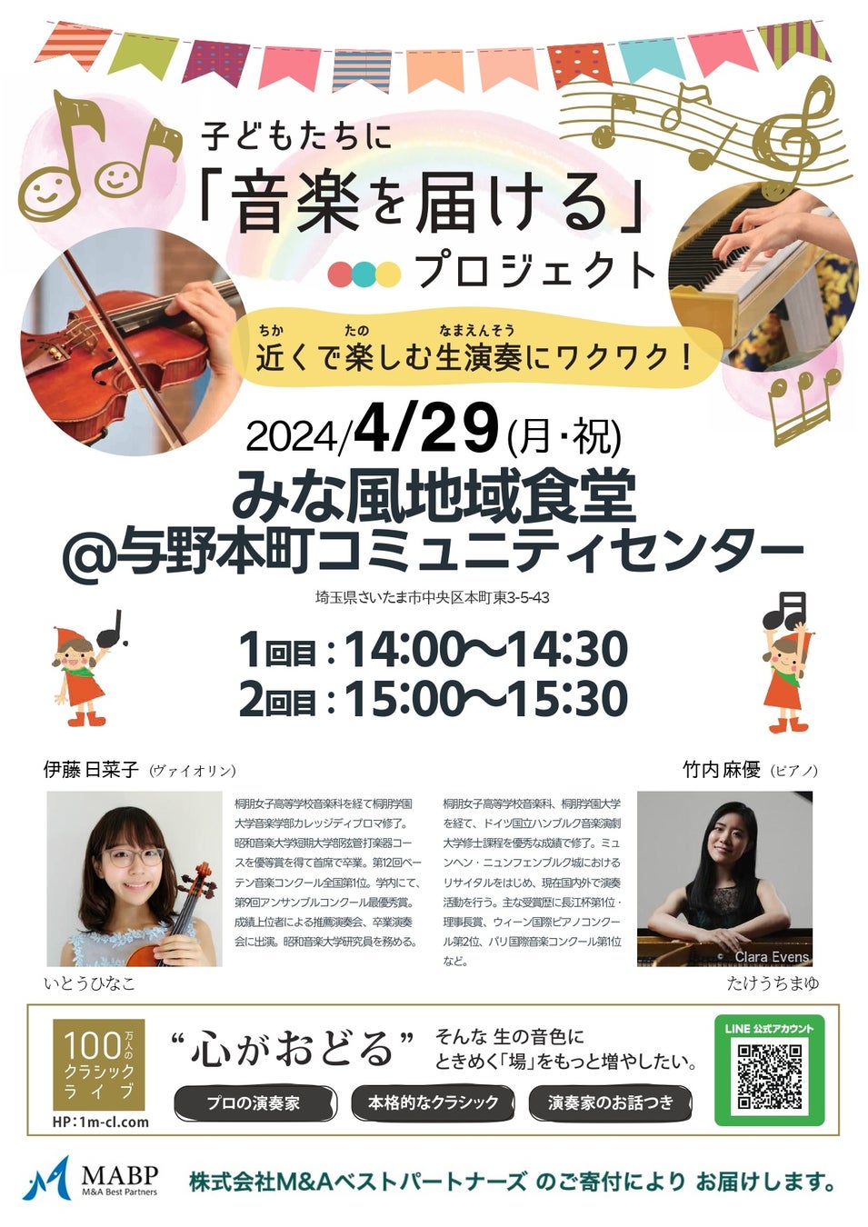 【M&Aベストパートナーズ×100万人のクラシックライブ】4月29日(月)に与野本町コミュニティセンターにて、クラシックライブを開催!