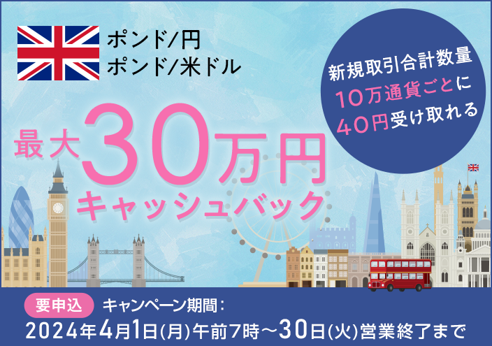 キャンペーンに申し込まれたお客さまに、期間中におけるポンド/円とポンド/米ドルの新規取引合計数量に応じて、最大300,000円をキャッシュバックします。