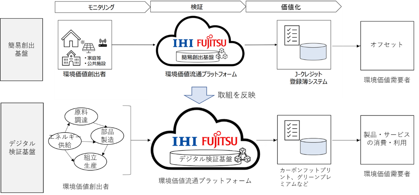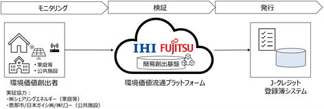 IHIと富士通はこれまで、IHIのIoT基盤「ILIPS」(アイリップス/IHI group Lifecycle Partner System)(注5)を通じて収集されたデータから算出したCO2削減量を環境価値としてトークン(注6)化し、異なるブロックチェーン同士を安全に相互接続する富士通の「ConnectionChain(コネクションチェーン)」(注7)を活用して環境価値取引市場に流通させるプラットフォーム「環境価値流通プラットフォーム」の実現に向けた共同事業プロジェクトを2022年度より進めてきました。
