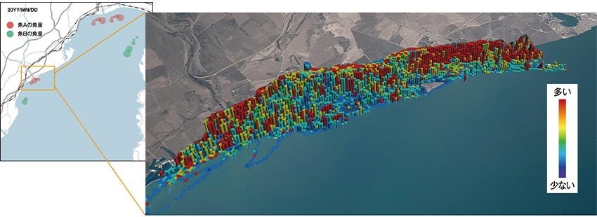 漁船の位置情報と魚探のエコーデータなどの操業データを集約することで、漁場の資源量の動向を把握することができます。