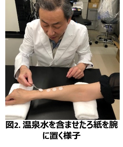 41℃の温泉水または精製水をろ紙に含ませ、腕に10分間置いた(図2)後、角層細胞を粘着テープで採取し染色・観察しました。肌のうるおい力や保護力との関連が分かっている「角層細胞のはがれ具合・大きさ・形」をもとに温泉の作用を判定しました。