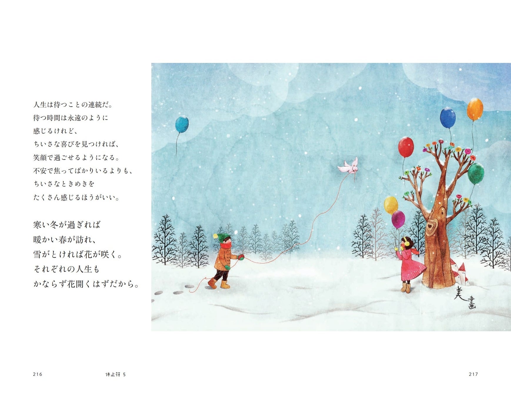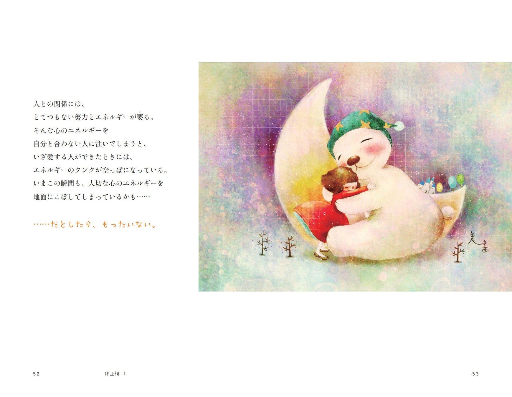 春の陽だまりのような暖かいイラストとエッセイは、生きていく中で夢に向かって奮闘するあなた、 人間関係でつらい時を過ごすあなた、愛に傷ついたあなたの心にそっと触れてくれるとともに、優しい言葉とイラストを通して休息を与えてくれる。