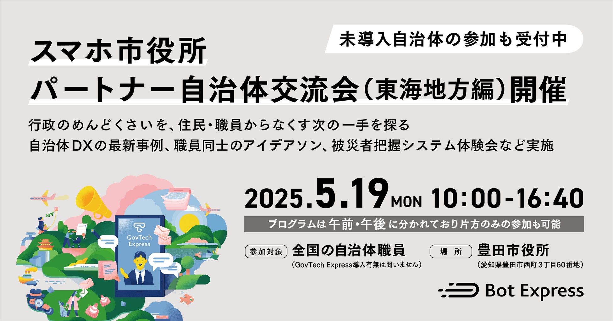 豊田市(市長:太田 稔彦)と株式会社Bot Express(本社:東京都港区、代表取締役:中嶋 一樹、以下 Bot Express)は、5月19日(月)に豊田市役所において「スマホ市役所 パートナー自治体交流会(東海地方編)」を開催することをお知らせいたします。