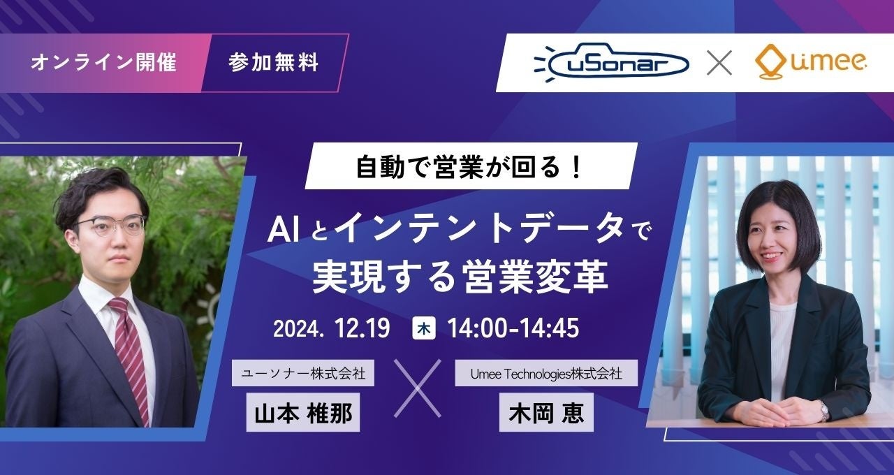 新人からトップセールスを輩出するコネクテッドセールス・プラットフォーム*「Front Agent」を開発・提供するUmee Technologies株式会社(本社:東京都調布市、代表取締役:新納 弘崇、以下「ユミー」)と日本最大級の法人データベースサービスを提供するユーソナー株式会社(本社:東京都新宿区、代表取締役会長:福富 七海、代表取締役社長:長竹 克仁、以下「ユーソナー」)は、12月19日(木)14:00 - 14:45に共催オンラインセミナー「自動で営業が回る!AIとインテントデータで実現する営業変革〜売上アップを達成したABMとインテントのセールスサイクル実例」を開催いたします。
