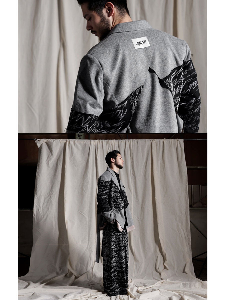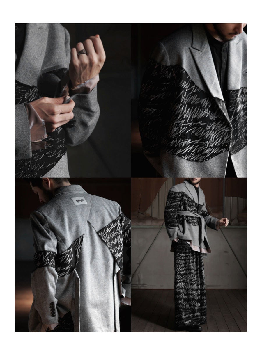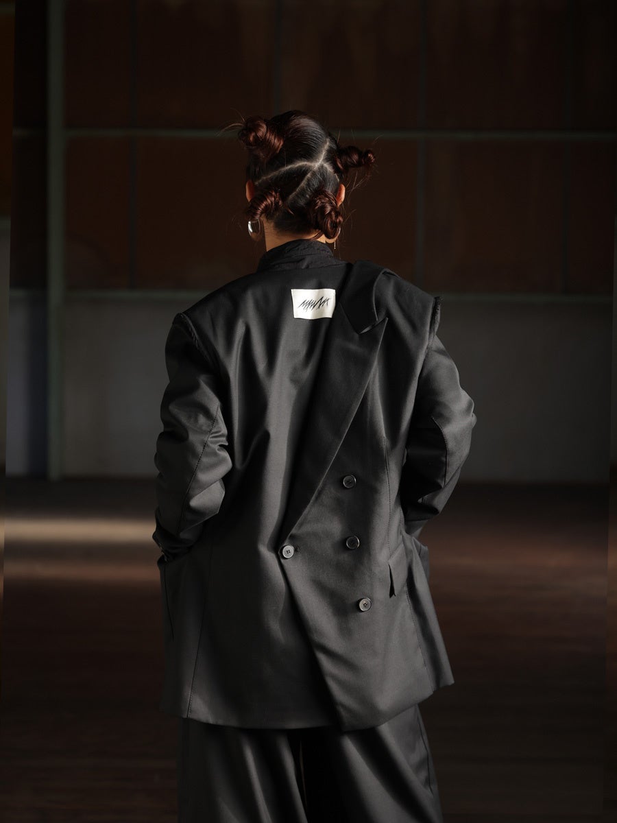 すっきりとしたショルダーラインとルーズなアウトフィットで整えられた製品。