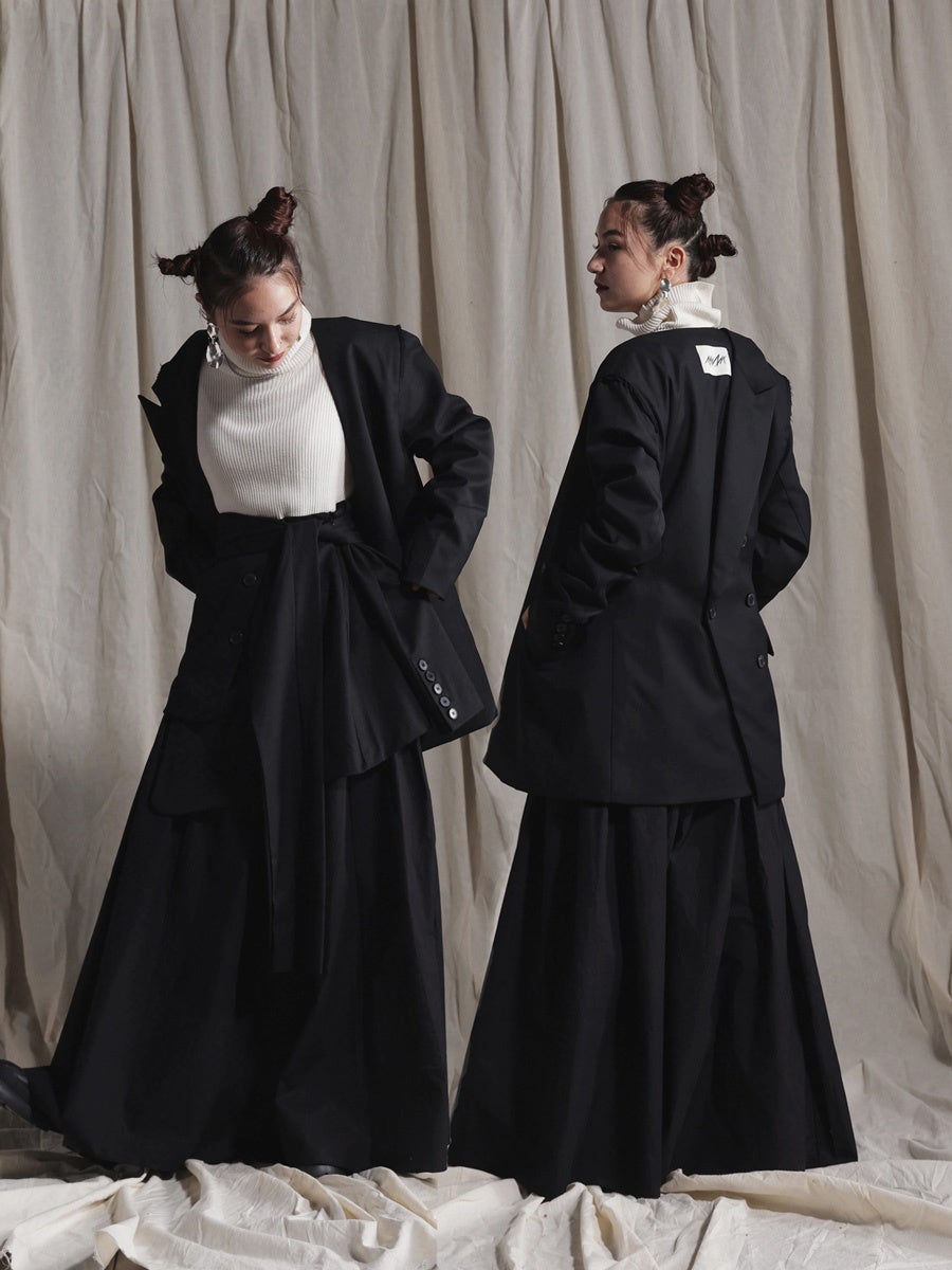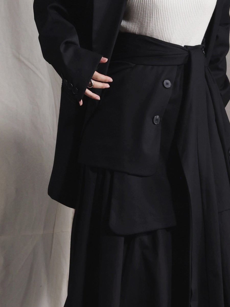 ボリュームのあるAラインスカートにジャケットをレイヤードしたような他にはないデザイン。