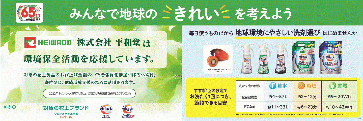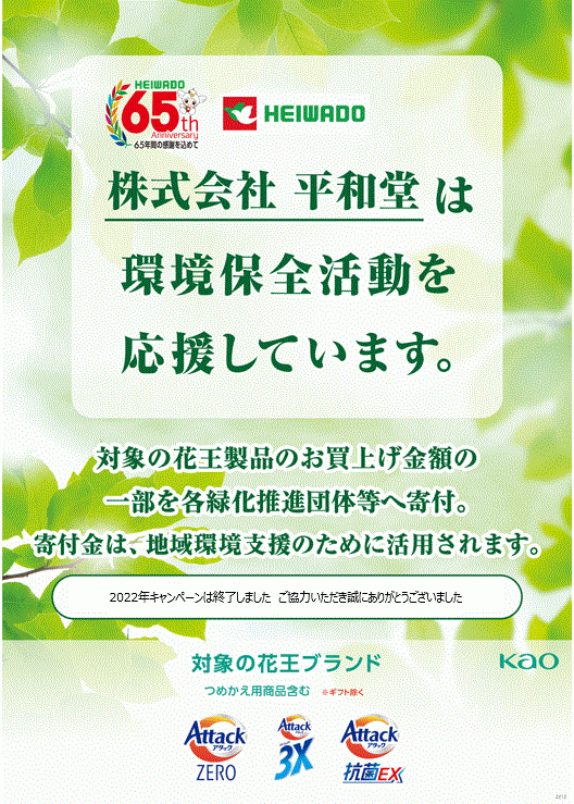 期間中に各店舗で販売した花王ブランド対象商品(対象:アタックZERO、アタック抗菌EXシリーズ)の売上金額の一部を、出店エリア(2府7県)ごとに集計し、各地域の環境保全活動の応援として、緑化を推進する団体等に寄付するものです。店舗をご利用のお客様には、ポスターによる店頭告知の他、平和堂ホームページやアプリ等を活用しご協力をお願いしました。