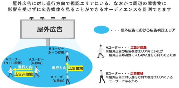 本特許技術は、当社のサービス「Geo-Research(ジオリサーチ)」と統合することにより、屋外広告の視認可能なオーディエンス(OTC: Opportunity To Contact)のみならず、実際に広告を視認した可能性の高いオーディエンス(VAC: Viewed Advertising Contact)までも高精度で測定することができます。