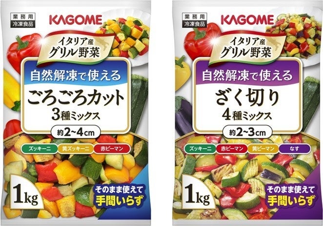左から、「自然解凍で使えるごろごろカット3種ミックス」1kg、自然解凍で使えるざく切り4種ミックス」1kg