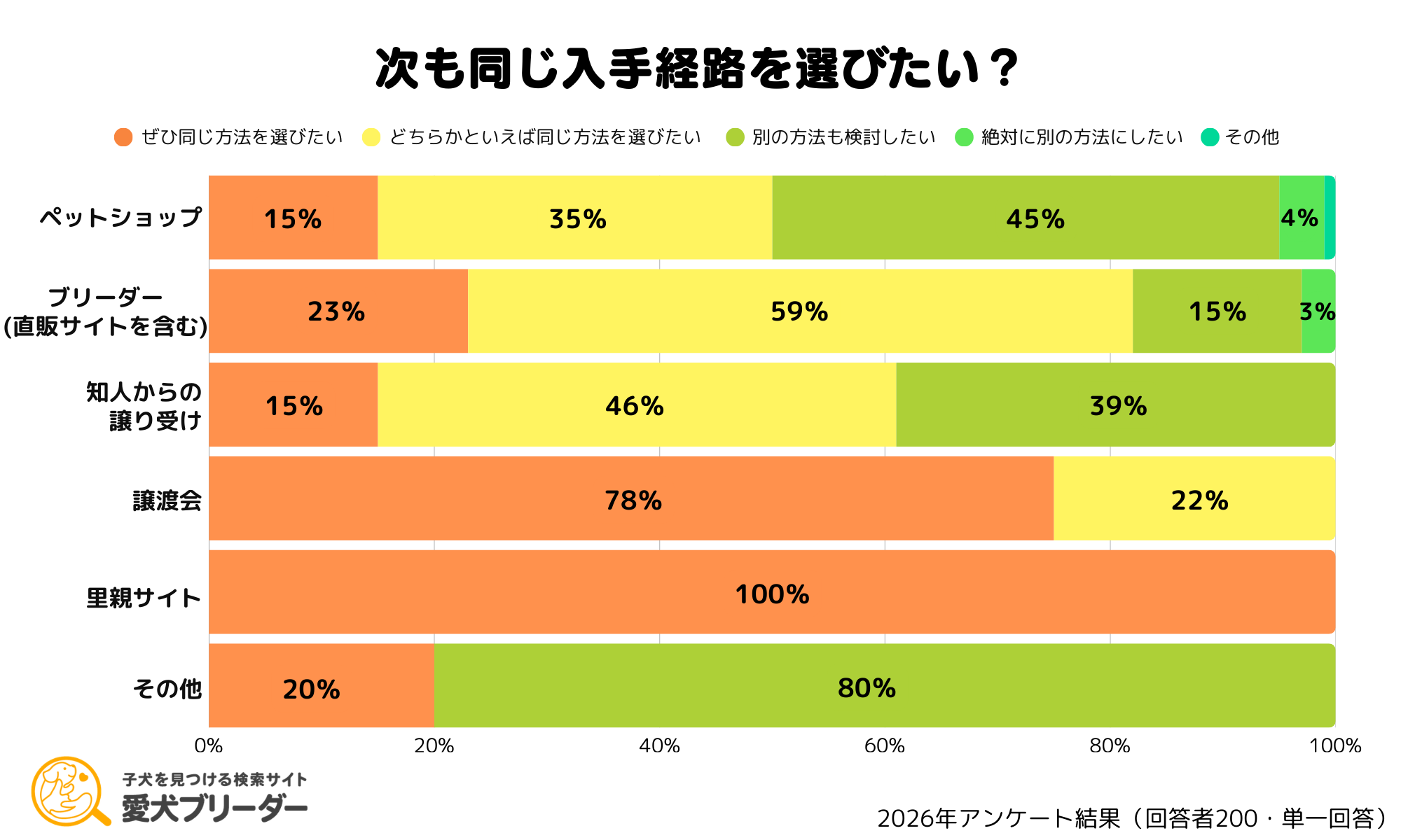 ◆ 譲渡会・里親サイトは100%、ブリーダー利用者は80%以上が「次も同じ経路」を希望。