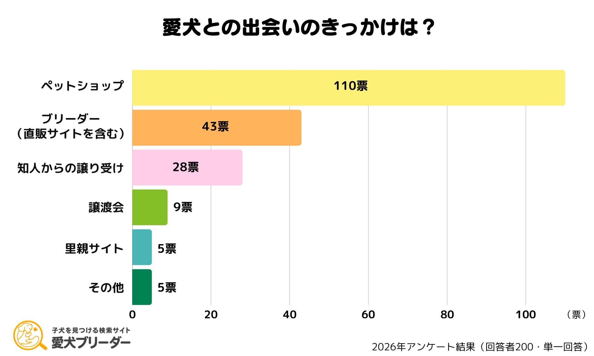 まず、愛犬との出会いのきっかけ(入手経路)を尋ねたところ、「ペットショップ」が110票(55%)で最多となりました。次いで「ブリーダー」が43票(21.5%)、「知人からの譲り受け」が28票(14%)と続いています。