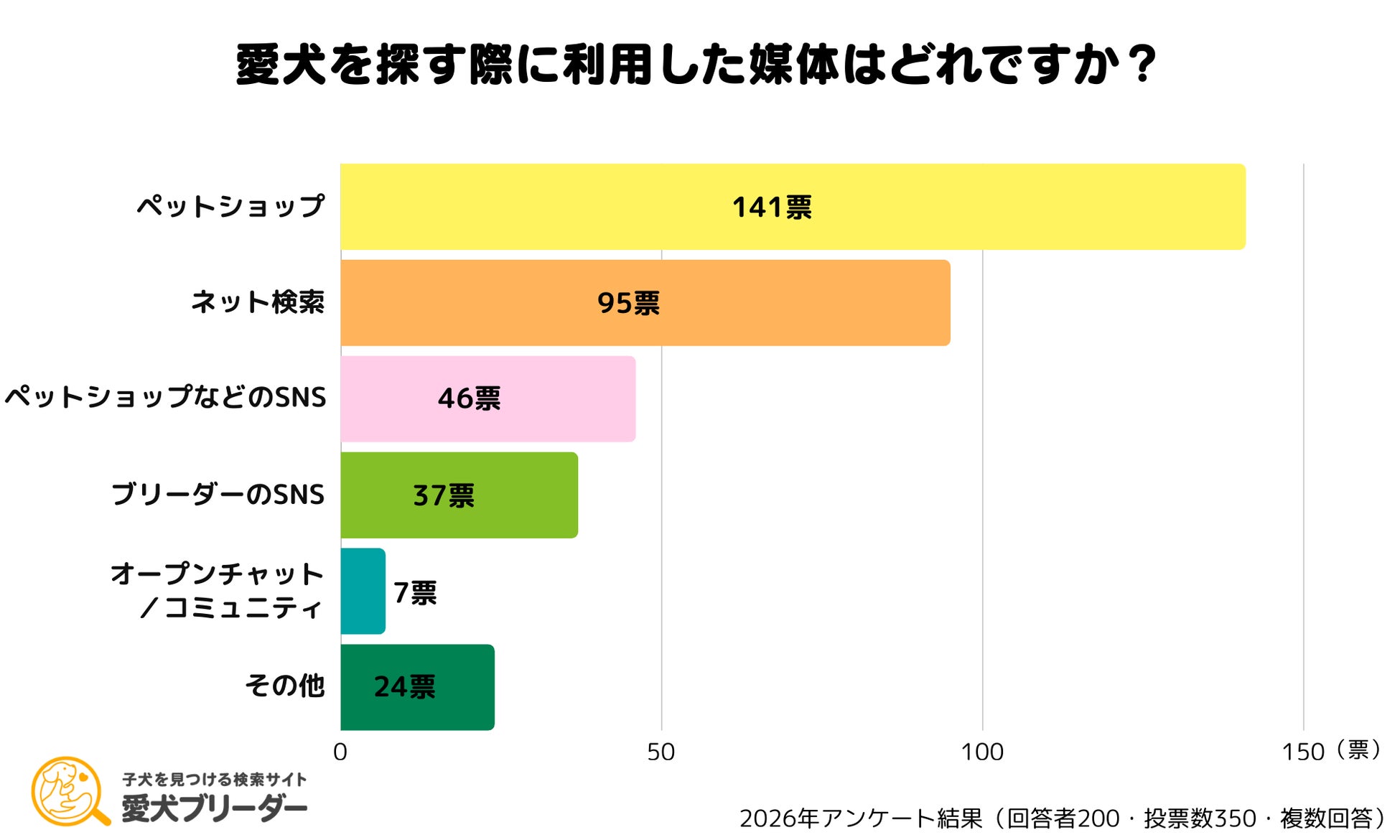 愛犬を探す際に参考にした媒体については、「ペットショップ(実際に店舗に行った/問い合わせた)」が141票(70.5%)で最多となり、直接足を運んで探すスタイルが根強いことがわかりました。