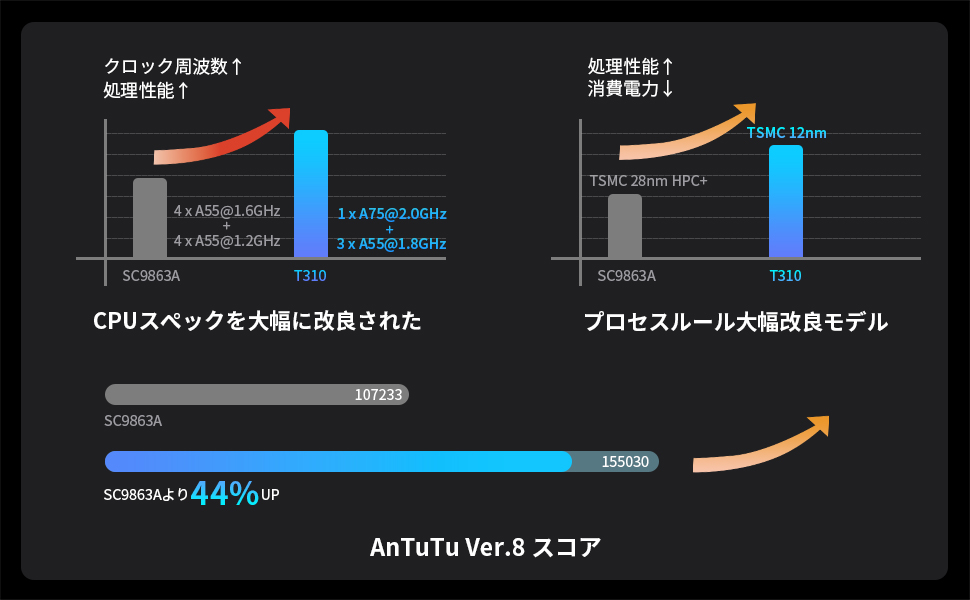 👍👍この BMAX Android11 タブレットはUNISOC T310セッサを搭載しています。TSMCの12nmプロセスルールを利用して製造されUNISOC T310は、高性能な「A75(2.0Ghz)」コアと三つの高効率な「A55」コアを搭載し、AnTuTu実行ポイントも150,000を超えます。これにより、高いパフォーマンスと高い電力効率を両立させています。さらに、6600mAhの大容量バッテリーを搭載し、6時間の動画を再生することができます!