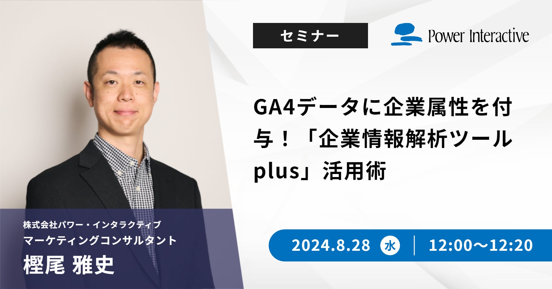 株式会社パワー・インタラクティブは、BtoB企業の方を対象に、無料ウェビナー『GA4データに企業属性を付与!「企業情報解析ツールplus」活用術』を、8月28日に開催します。