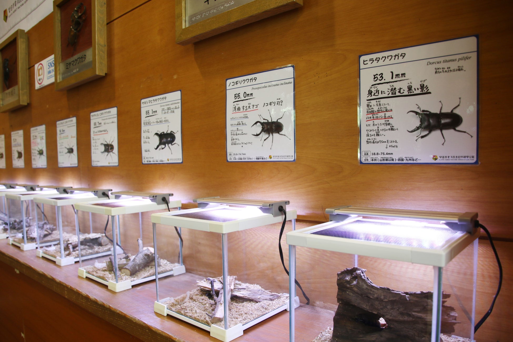 会場入口から背の順(小さい順)で並んで展示しています。小さい虫から観察を始め、隣の展示と見比べていくとどんどん大きくなっていく、驚きとワクワクが止まらないような展示になっています。一番最後に展示されているのはカブトムシ?クワガタムシ?