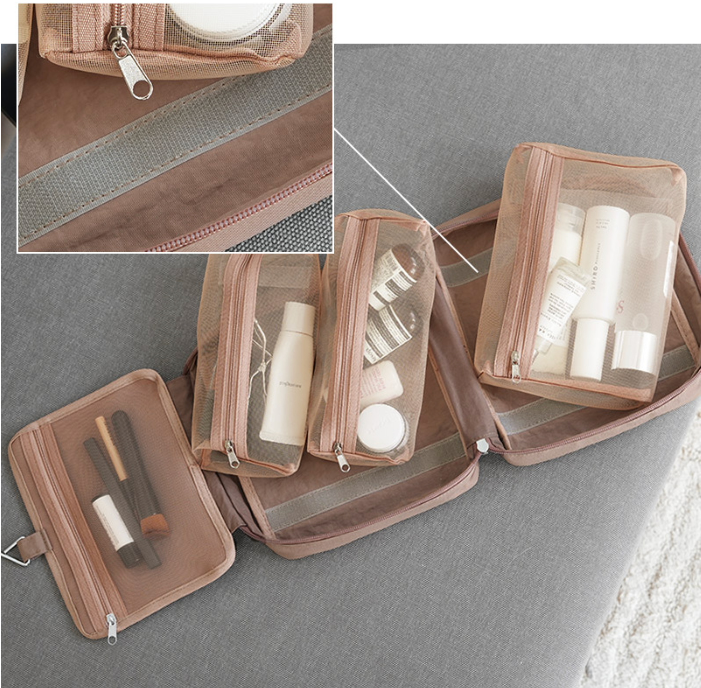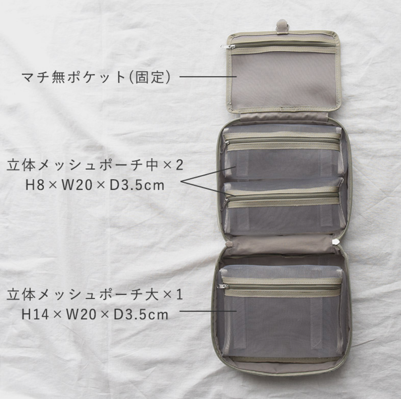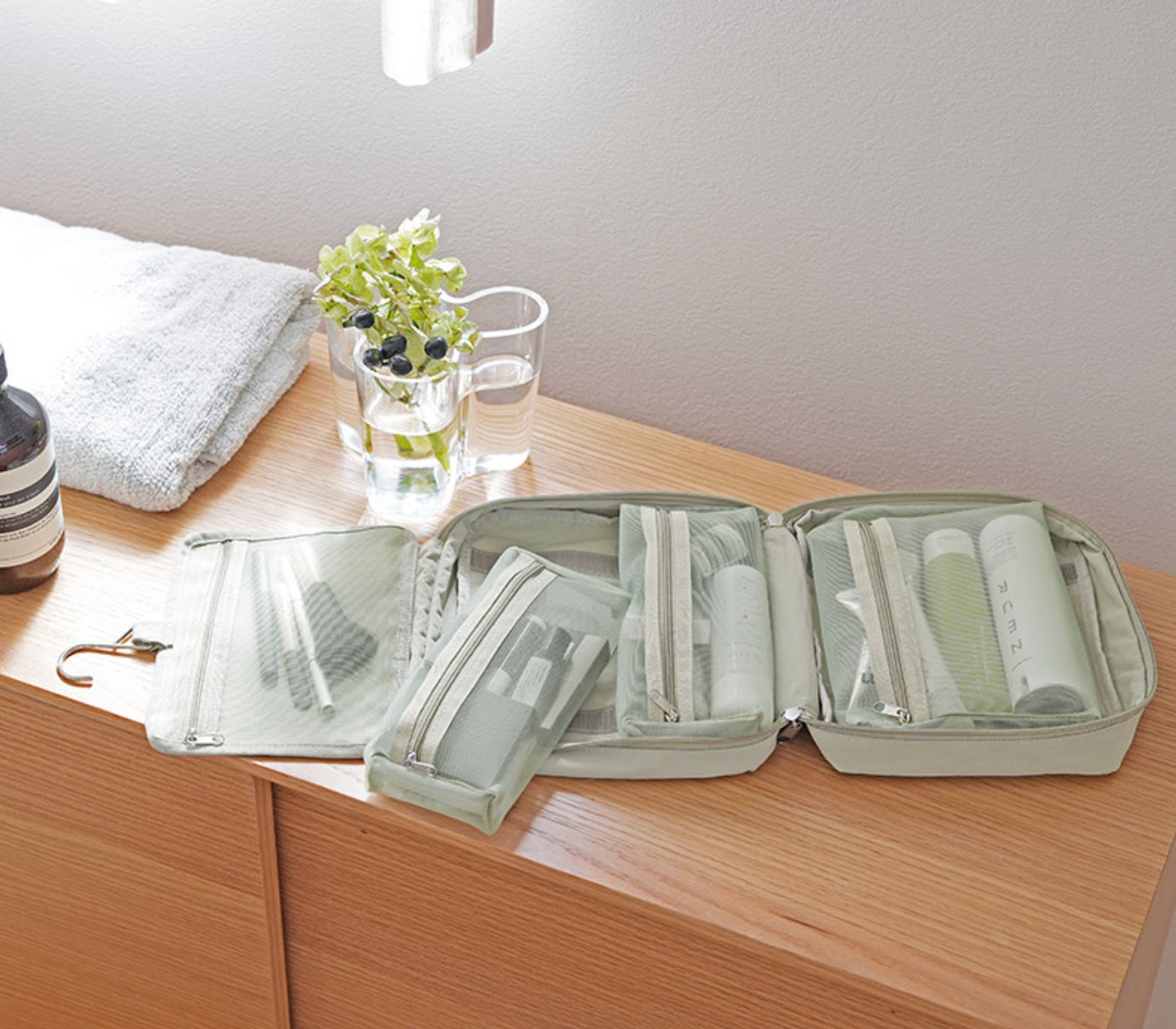 それぞれのメッシュポーチに化粧水などのボトルやコスメなどを仕分けて収納でき、なおかつひとまとめにしておけるので、旅行の荷物がスッキリと整理できます。